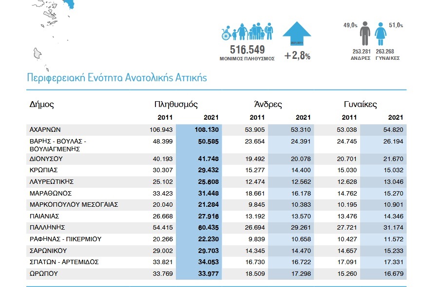 Αύξηση πληθυσμού καταγράφεται στα βορειοανατολικά προάστια της Αθήνας, σε πλήρη αντίθεση με την υπόλοιπη Αττική, σύμφωνα με τα αποτελέσματα της Απογραφής της ΕΛΣΤΑΤ.