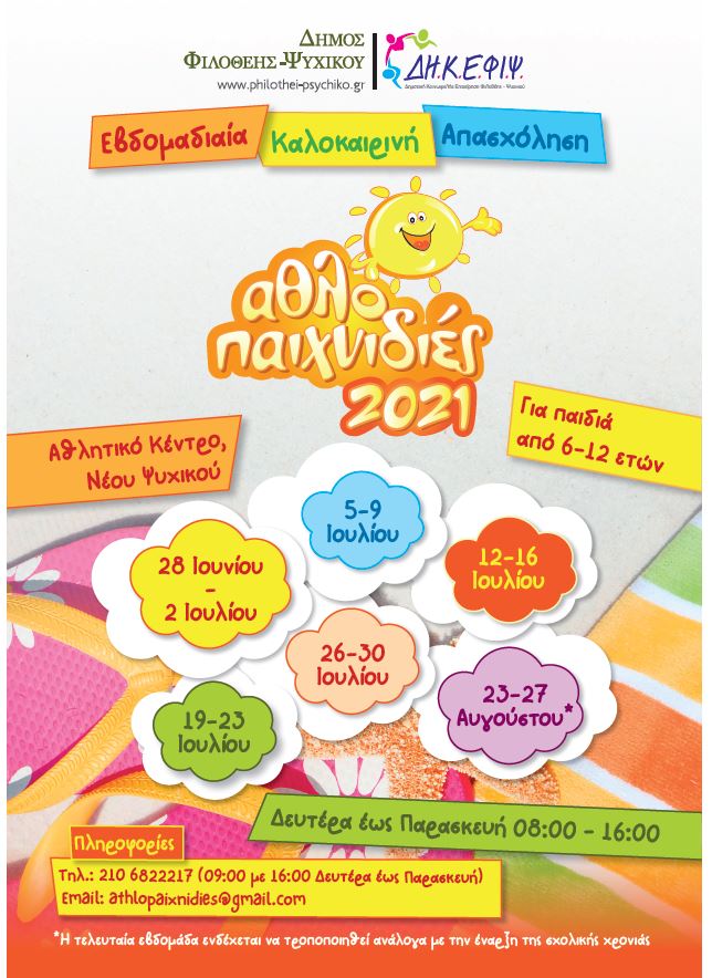 Οι Αθλοπαιχνιδιές 2021, θα πραγματοποιηθούν από τις 28 Ιουνίου έως τις 30 Ιουλίου 2021 & από τις 23 έως τις 27 Αυγούστου 2021 (*Η τελευταία εβδομάδα ενδέχεται να τροποποιηθεί αναλόγως της έναρξης της σχολικής χρονιάς αλλά και τη διαμόρφωση της ζήτησης από τους πολίτες) , στο Αθλητικό Κέντρο Νέου Ψυχικού.