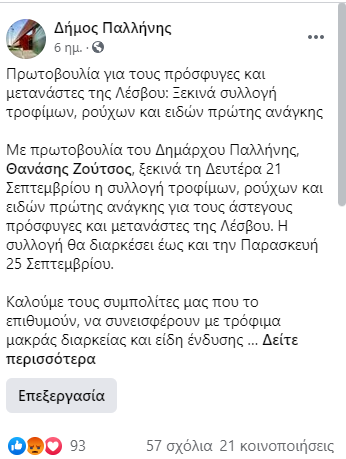 Ακραία επίθεση δέχτηκε η σελίδα του Δήμου Παλλήνης στο facebook, από «αγανακτισμένους πολίτες» που διαμαρτύρονταν για την πρωτοβουλία του Δημάρχου, Θανάση Ζούτσου να συγκεντρωθούν είδη πρώτης ανάγκης για τους πρόσφυγες της Λέσβου.