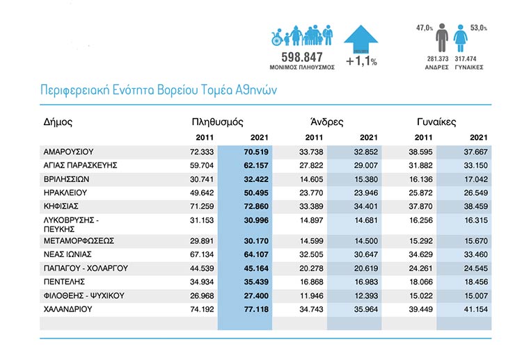 Αντίθετα, το Μαρούσι και η Νέα Ιωνία καταγράφουν σημαντική μείωση. Ισχνή ειναι η αύξηση πληθυσμού σε Κηφισιά, Μεταμόρφωση, Λυκόβρυση-Πεύκη και Ηράκλειο.