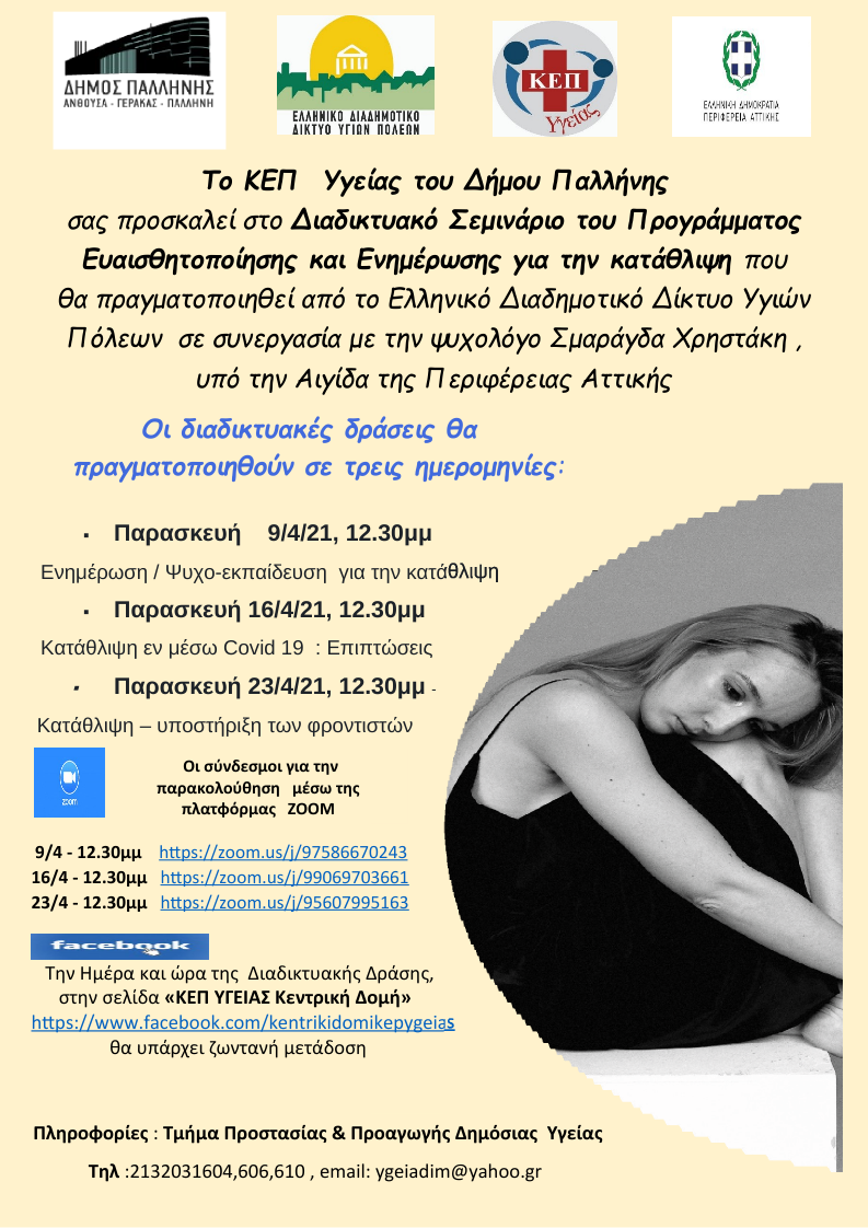 Το ΚΕΠ Υγείας του Δήμου Παλλήνης σας προσκαλεί στο Διαδικτυακό Σεμινάριο του Προγράμματος Ευαισθητοποίησης και Ενημέρωσης για την κατάθλιψη που θα πραγματοποιηθεί από το Ελληνικό Διαδημοτικό Δίκτυο Υγιών Πόλεων σε συνεργασία με την ψυχολόγο Σμαράγδα Χρηστάκη , υπό την Αιγίδα της Περιφέρειας Αττικής.