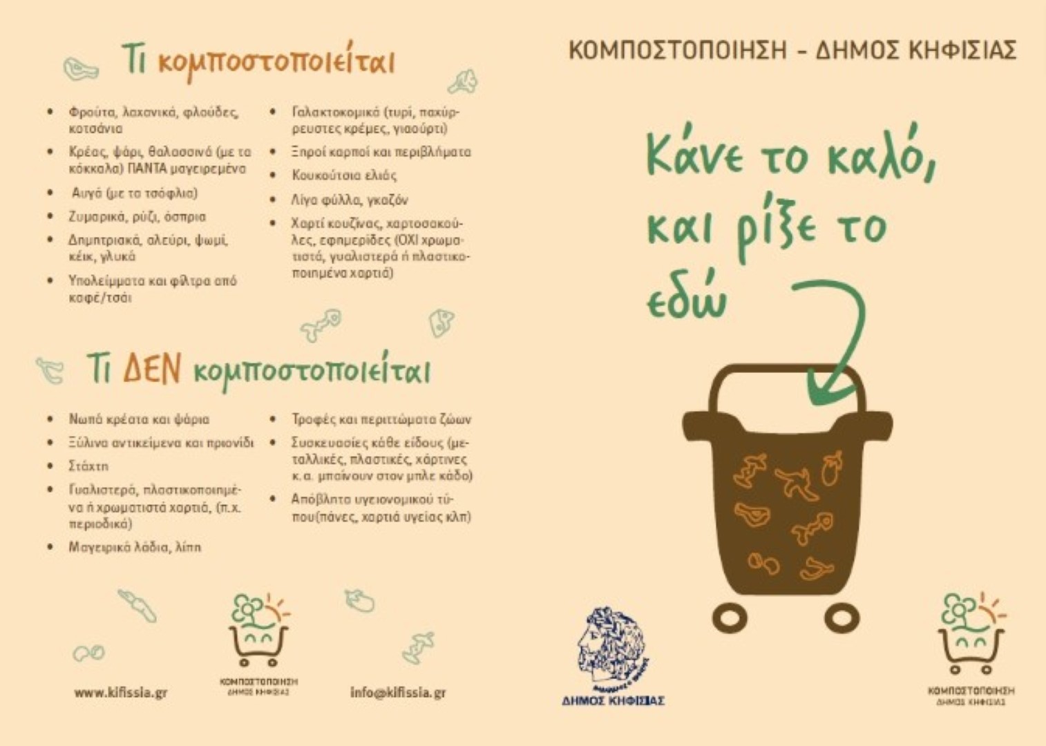 Ο Δήμος Κηφισιάς καλεί τους κατοίκους που δε δήλωσαν συμμετοχή και επιθυμούν να ενταχθούν στο πρόγραμμα χωριστής συλλογής υπολειμμάτων τροφών να δηλώσουν τη συμμετοχή τους μέσω του portal του Δήμου (e-υπηρεσίες >πολίτες >δήλωση για τη συμμετοχή στη συλλογή βιοαποβλήτων).