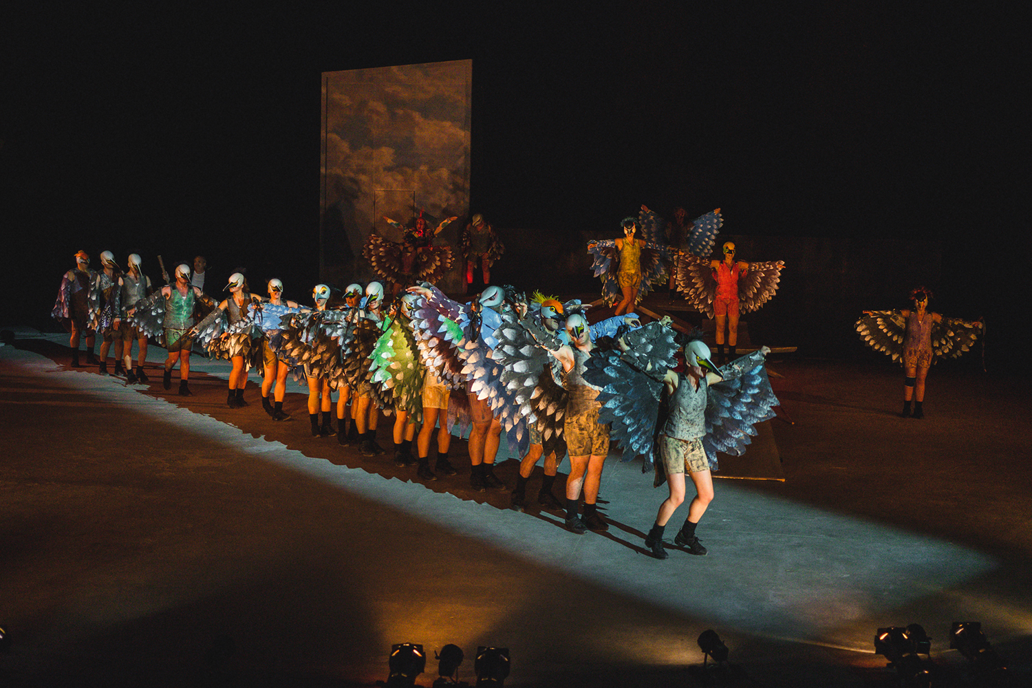 Παίζουν (με αλφαβητική σειρά) Ελευθερία Αγγελίτσα (Τριβαλλός), Λίλα Βλαχοπούλου (Υπηρέτης του Έποπα), Ιωάννα Δεμερτζίδου (Κήρυκας, Πουλί από το Παρελθόν), Δημήτρης Διακοσάββας (Κινησίας), Αριστοτέλης Ζαχαράκης (Επιθεωρητής, Ψευδομάρτυρας), Χριστίνα Ζαχάρωφ (Ψευδομάρτυρας, Δούλος), Στεφανία Ζώρα (Β΄ Αγγελιοφόρος), Ήριννα Κεραμίδα (Ψευδομάρτυρας, Δούλος), Μαριάννα Κιμούλη (Κήρυκας), Γιώργος Κολοβός (Προμηθέας), Αναστασία-Ραφαέλα Κονίδη (Κήρυκας), Μάρα Μαλγαρινού (Κήρυκας, Πουλί Δερβίσης), Τατιάνα Μελίδου (Ψευδομάρτυρας, Βασιλεία), Χρυσή Μπαχτσεβάνη (Κήρυκας), Κλειώ-Δανάη Οθωναίου (Ίρις), Βασίλης Παπαδόπουλος (Μέτων, Ψευδομάρτυρας), Γρηγόρης Παπαδόπουλος (Ηρακλής), Θανάσης Ραφτόπουλος (Μέτων, Ψευδομάρτυρας), Θανάσης Ρέστας (Α΄ Αγγελιοφόρος, Ποσειδών), Γιάννης Σαμψαλάκης (Ευελπίδης), Περικλής Σιούντας (Συνταγματολόγος, Ψευδομάρτυρας), Κατερίνα Σισίννι (Αγγελιοφόρος), Βασίλης Σπυρόπουλος (Ιερέας), Χρήστος Στέργιογλου (Έποπας), Γιάννης Τσεμπερλίδης (Ποιητής), Ιώβη Φραγκάτου (Χρησμολόγος), Ταξιάρχης Χάνος (Πεισθέταιρος)