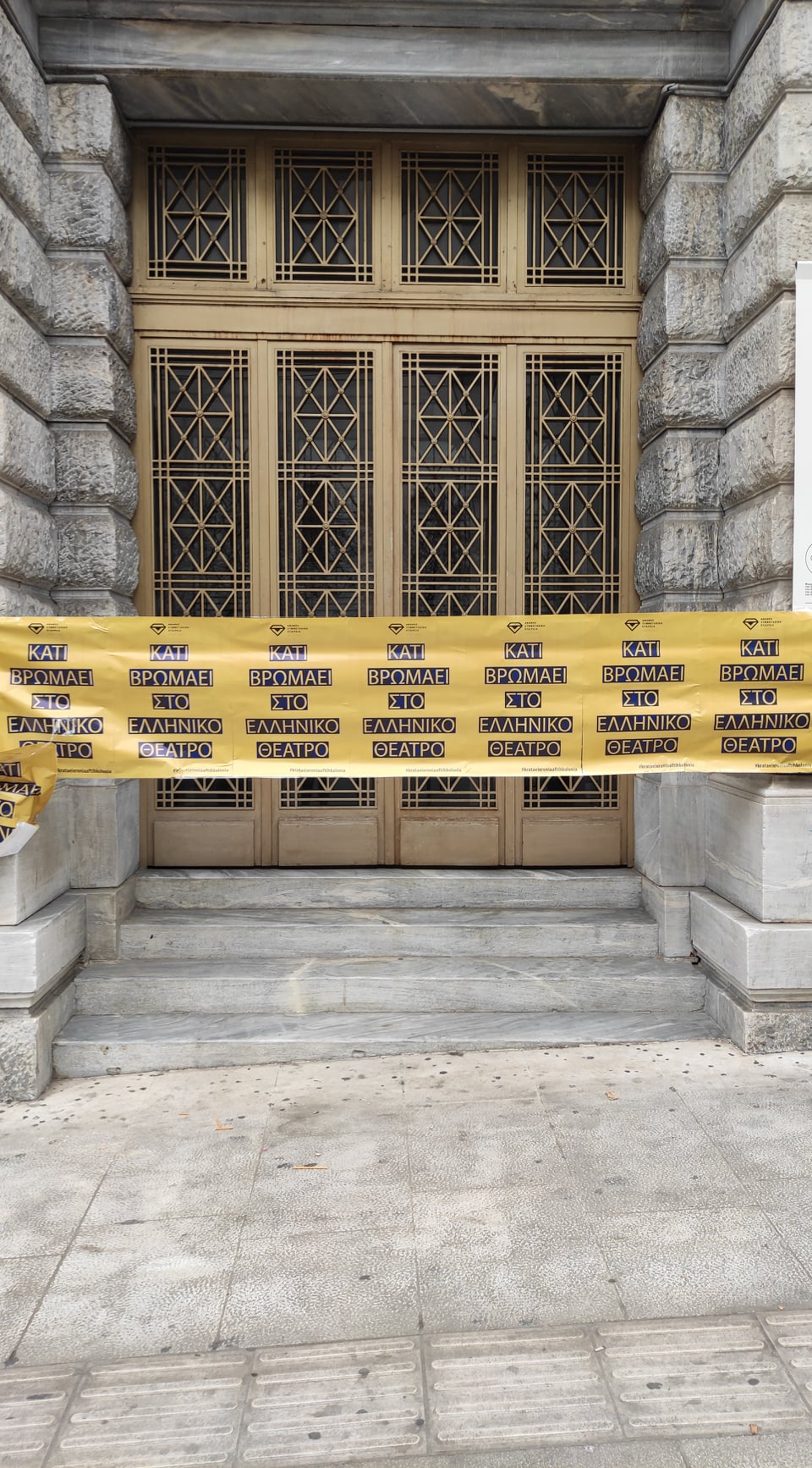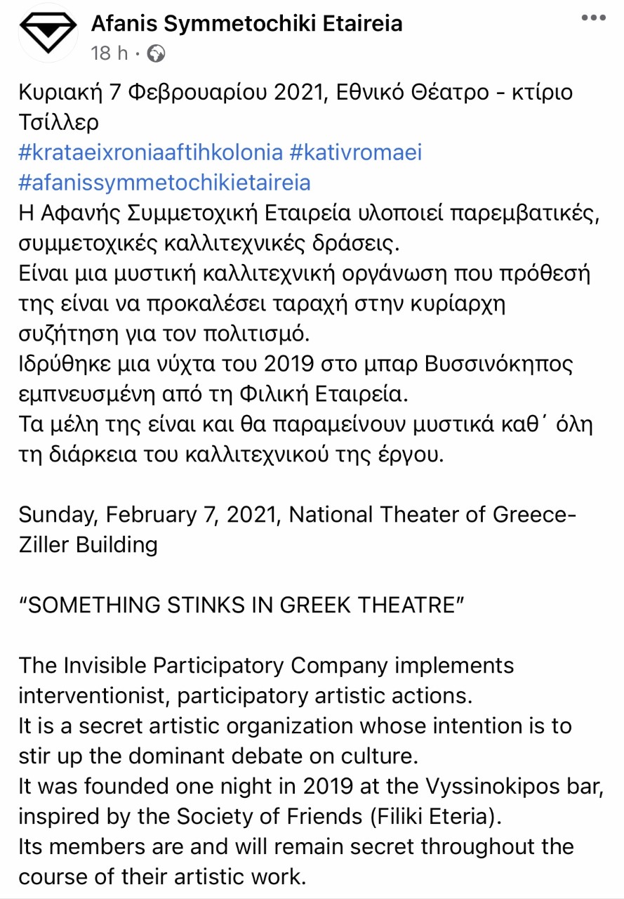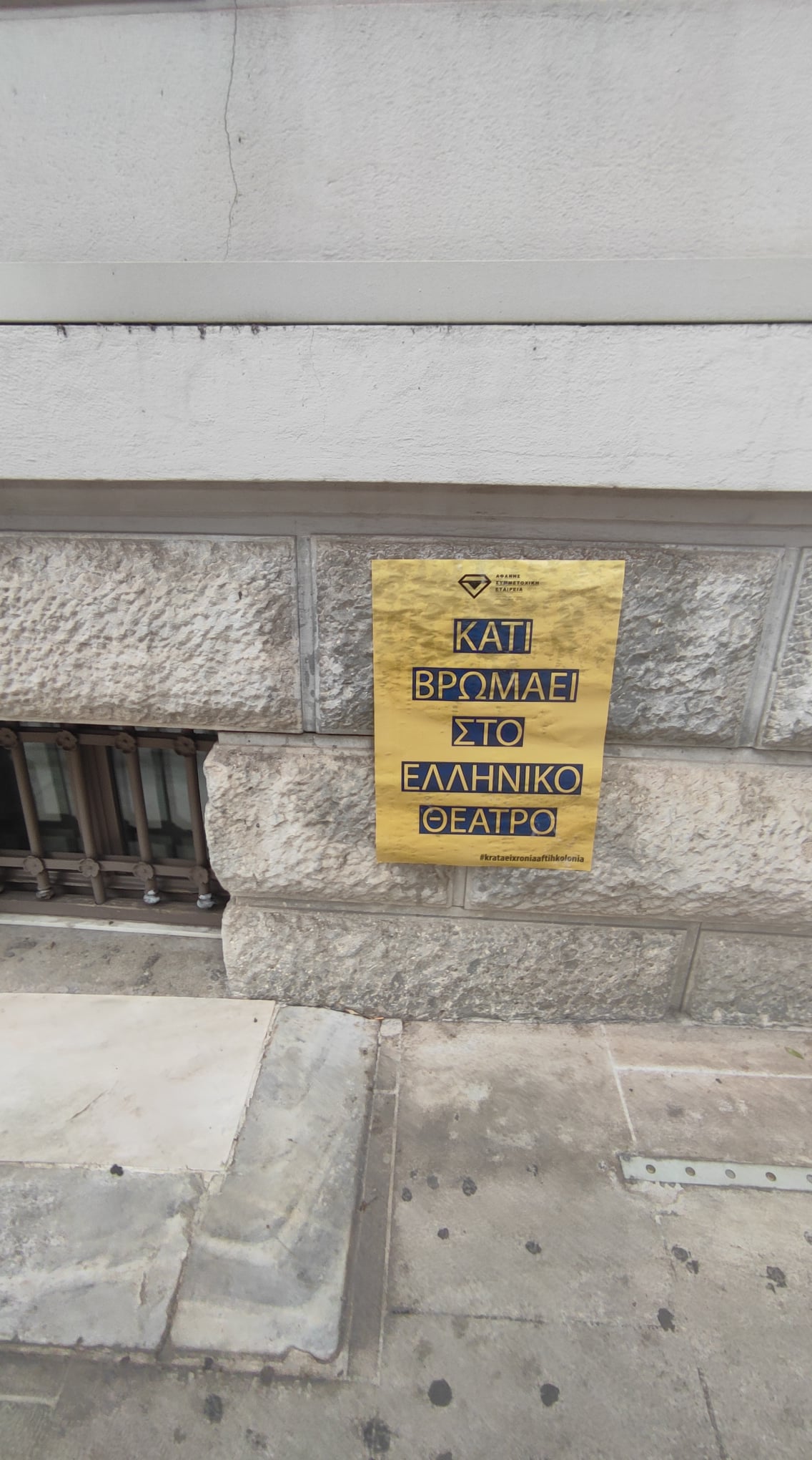 Ένα πανό που αναγράφει «Κάτι βρωμάει στο ελληνικό θέατρο» τοποθετήθηκε έξω από το κτίριο Τσίλερ του Εθνικού Θεάτρου, ύστερα από την επισημοποίηση της παραίτησης του διευθυντή του Δημήρη Λιγνάδη. Πίσω από την κίνηση αυτή φέρεται να είναι η ομάδα «Αφανής Συμμετοχική Εταιρεία» η οποία ανάρτησε και σχετικές φωτογραφίες σε σελίδα της στο Facebook.
