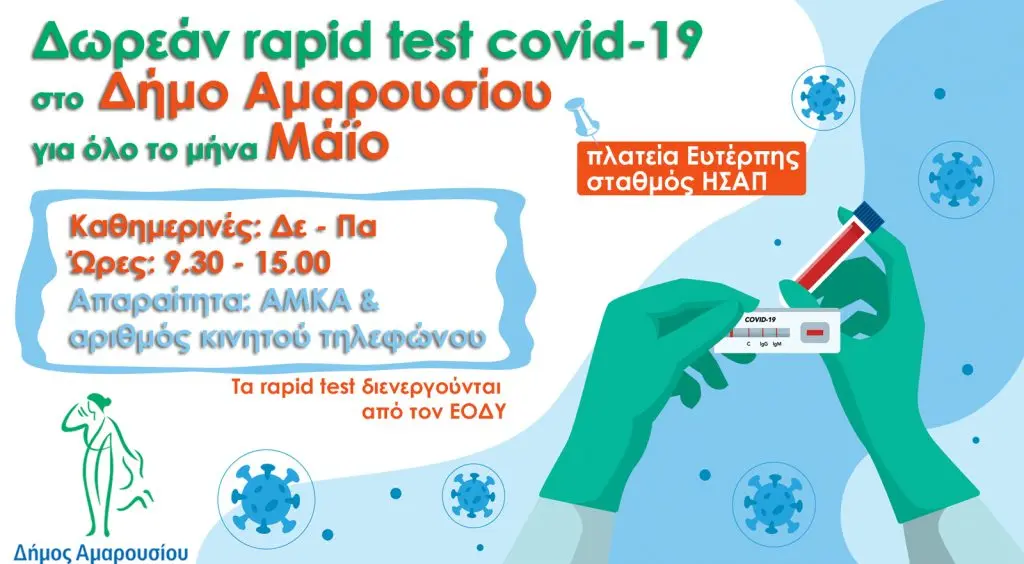 Όπως έχουμε αναφέρει ξανά,  και για τον Μάϊο τα δωρεάν rapid test θα συνεχίζονται στην πλατεία Ευτέρπης – Σταθμό ΗΣΑΠ, εξυπηρετώντας με αυτό τον τρόπο όχι μόνο τις Μητροπολιτικές ανάγκες του Αμαρουσίου αλλά και τους όμορους Δήμους.