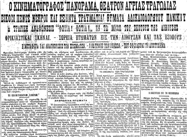 Σαν σήμερα, το 1924, 25 άνθρωποι πέθαναν και 18 τραυματίστηκαν στο θρυλικό Σινέ Πανόραμα στην Αθήνα, Γ’ Σεπτεμβρίου και Χαλκοκονδύλη, από τον πανικό που προκλήθηκε όταν ακούστηκε η κραυγή “Φωτιά, φωτιά!”. Μέχρι σήμερα κανείς δε γνωρίζει τι πραγματικά συνέβη. Επικίνδυνη φωτιά σίγουρα δεν υπήρξε μιας και τα πυροσβεστικά οχήματα που κατέφθασαν στο σημείο δε χρειάστηκε να επέμβουν. Κι έτσι εκείνη η προβολή της ταινίας του Τσάρλι Τσάπλιν πήρε διαστάσεις ανθρώπινης τραγωδίας εξαιτίας… του πανικού!