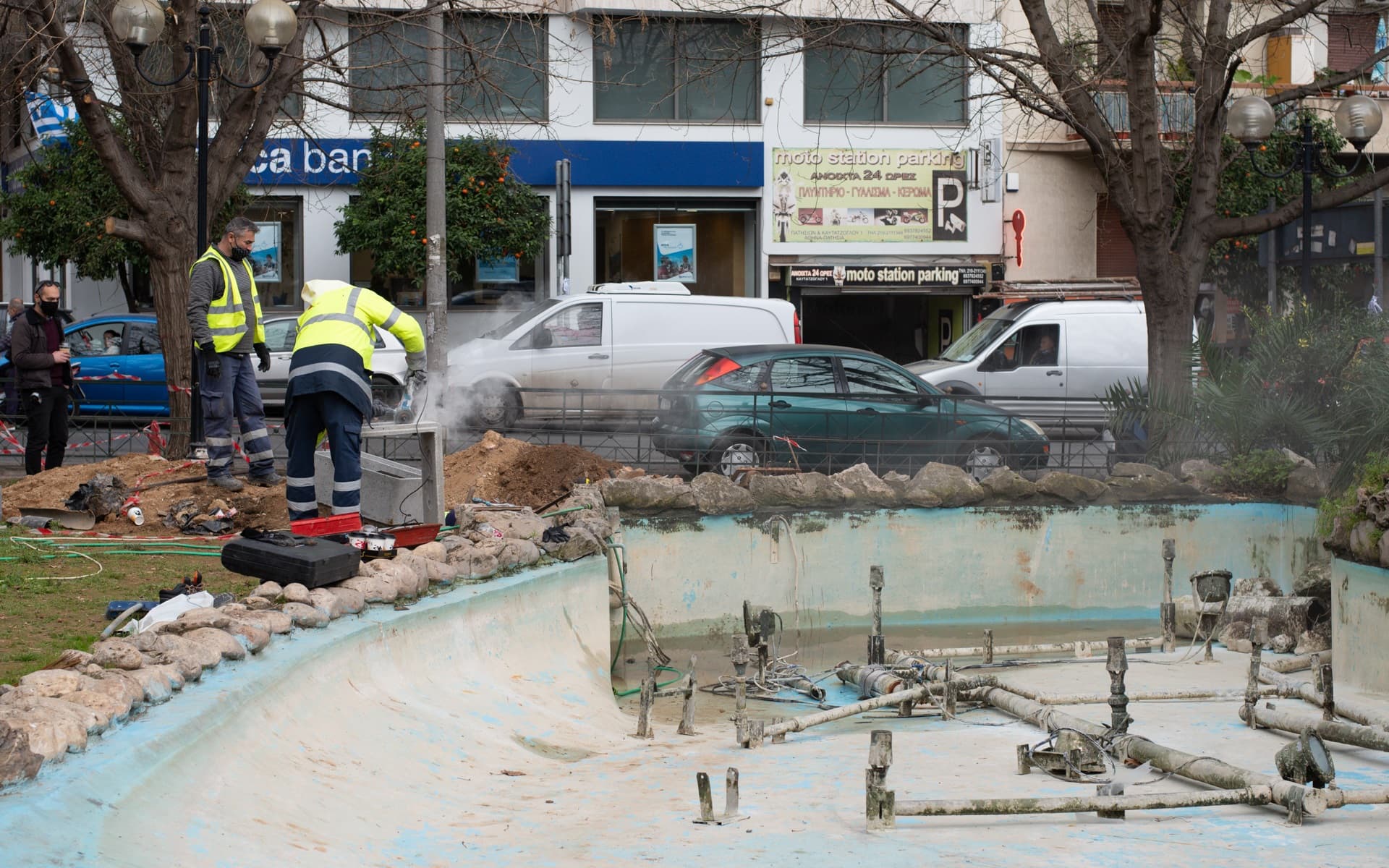 Μικτά κλιμάκια εξειδικευμένων τεχνιτών πραγματοποιούν εργασίες καθαρισμού, επισκευής και αποκατάστασης στα δεκάδες σιντριβάνια της πόλης, με επισκευές στα συστήματα αποχέτευσης και ηλεκτροφωτισμού, οικοδομικές εργασίες, στεγανοποιήσεις, αποκαταστάσεις μαρμάρινων ποδιών και γενικά του εκσυγχρονισμού τους και της αποκατάστασης της λειτουργικότητάς τους.