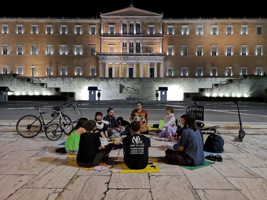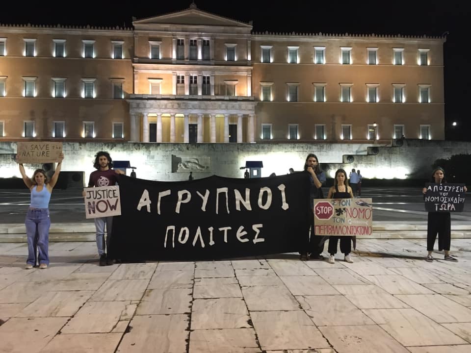 Πρώτη μέρα της άρσης των μέτρων της κυκλοφορίας εξαιτίας της πανδημίας, πολίτες όλων των ηλικιών, συγκεντρωθήκαμε έξω από τη Βουλή των Ελλήνων και των Ελληνίδων με σκοπό να διαμαρτυρηθούμε για το «αντι-περιβαλλοντικό νομοσχέδιο». Είμαστε άνθρωποι που δεν εκπροσωπούν κάποιο κόμμα ή παράταξη, και τα πολιτικά μας πιστεύω διαφέρουν. Αρκετ@ από εμάς έχουν εμπειρία από κινητοποιήσεις, κινήματα, οικοκοινότητες, ενώ αλλ@ είναι η πρώτη φορά που δραστηριοποιούνται. Είμαστε ένα δημιουργικό μάγμα ανήσυχων, ελεύθερων πνευμάτων που θέλουμε να αφήσουμε έναν πλανήτη καλύτερο απ’ ότι τον βρήκαμε. Ενώ λοιπόν, μπορεί να μην είμαστε ίδιοι, αποδεχόμαστε και σεβόμαστε τη διαφορετικότητα. Είμαστε διαφορετικ@ μεταξύ μας, αλλά ισότιμ@. Υιοθετούμε τις αρχές της μη βίας – πολιτικής ανυπακοής και αυτό-οργανωνόμαστε οριζόντια. Είναι σημαντικό να προστεθεί πως αποφεύγουμε να χρησιμοποιούμε το άρθρο ‘’οι’’ καθώς δεν είμαστε κάποια ομάδα αλλά εδώ και 48 νύχτες συντονίζουμε τη σκέψη και τη δράση μας για έναν κοινό σκοπό· την απόσυρση του (αντι)περιβαλλοντικού νόμου και η διαμαρτυρία είναι ανοιχτή σε κάθε πολίτη να συμμετέχει και να ενωθεί με μας.