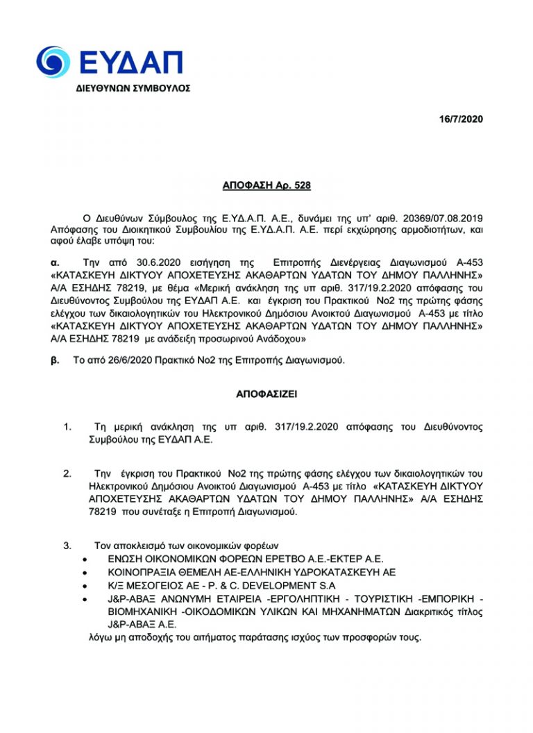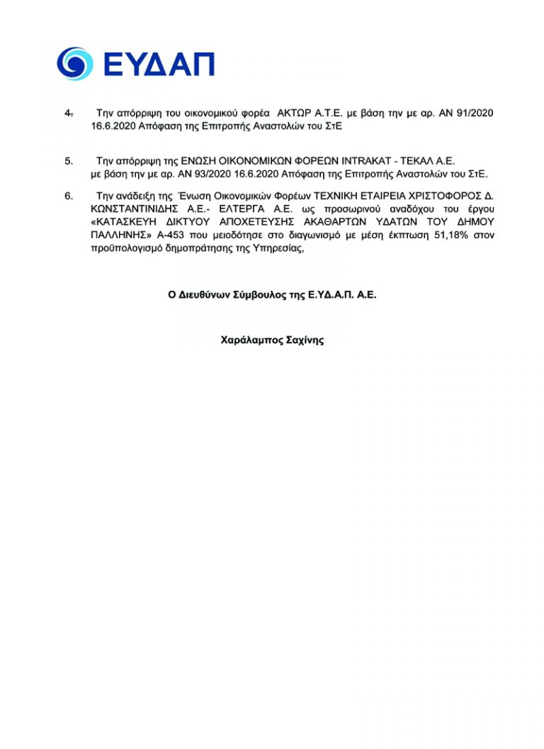 Με απόφαση του Διευθύνοντος Συμβούλου της ΕΥΔΑΠ, Χαράλαμπου Σαχίνη, η οποία δημοσιεύτηκε στη «Διαύγεια», ανακηρύσσεται ως προσωρινός ανάδοχος του έργου, η κοινοπραξία “ΤΕΧΝΙΚΗ ΕΤΑΙΡΕΙΑ ΧΡΙΣΤΟΦΟΡΟΣ Δ. ΚΩΝΣΤΑΝΤΙΝΙΔΗΣ-ΕΛΤΕΡΓΑ ΑΕ”.