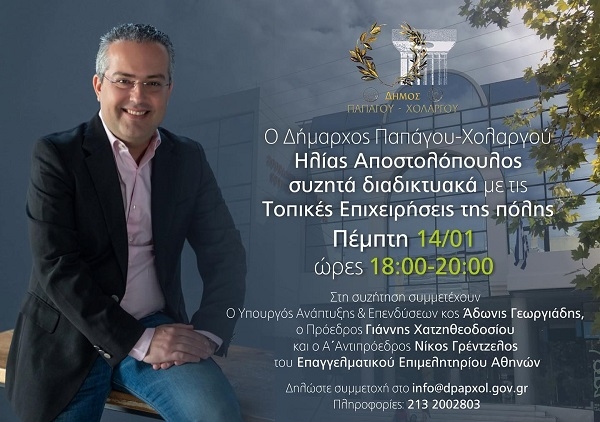 Ο Δήμαρχος Παπάγου – Χολαργού Ηλίας Αποστολόπουλος καλεί τις τοπικές επιχειρήσεις και τους επαγγελματίες του Δήμου σε διαδικτυακή συζήτηση με θέματα τις επιπτώσεις της υγειονομικής κρίσης, τα μέτρα ελάφρυνσης του Δήμου, προτάσεις και παρεμβάσεις, με σκοπό τη στήριξη και την ανάκαμψή τους , την Πέμπτη 14 Ιανουαρίου και ώρα 18.00.