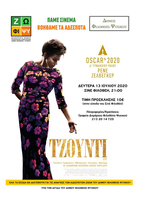 Σήμερα Δευτέρα 13 Ιουλίου στο σινεμά «Φιλοθέη», στις 9 το βράδυ, θα προβληθεί η ταινία «Τζούντι» του Ρούπερτ Γκουλντ με τη Ρενέ Ζελβέγκερ (Όσκαρ Α΄Γυναικείου Ρόλου 2020) στο πλαίσιο της εκδήλωσης «Πάμε σινεμά, βοηθάμε τα αδέσποτα».