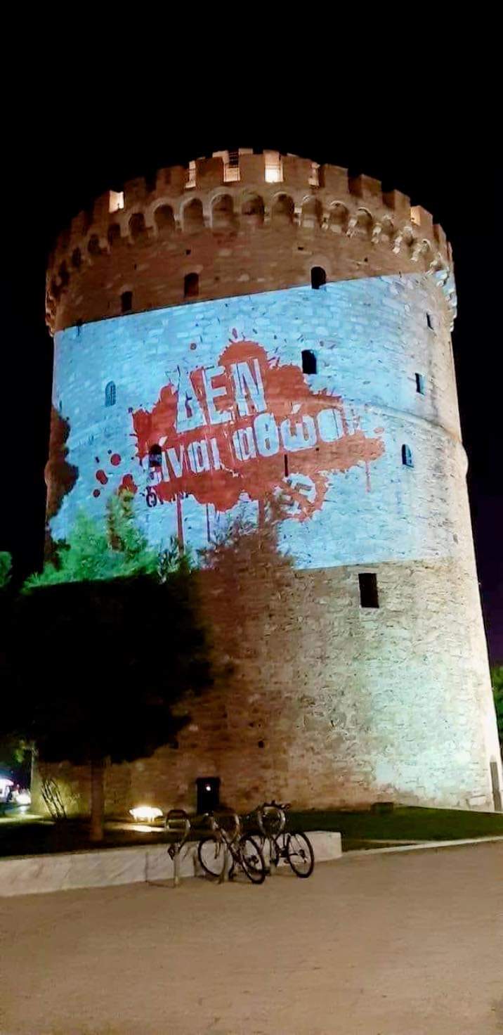 Στη Θεσσαλονίκη, μήνυμα καταδίκης των νεοναζί της Χρυσής Αυγής έστειλαν μέλη της Αντιρατσιστικής Πρωτοβουλίας Θεσσαλονίκης προβάλλοντας με προτζέκτορα στον Λευκό Πύργο το μήνυμα «Δεν είναι αθώοι-Οι ναζί στη φυλακή».
