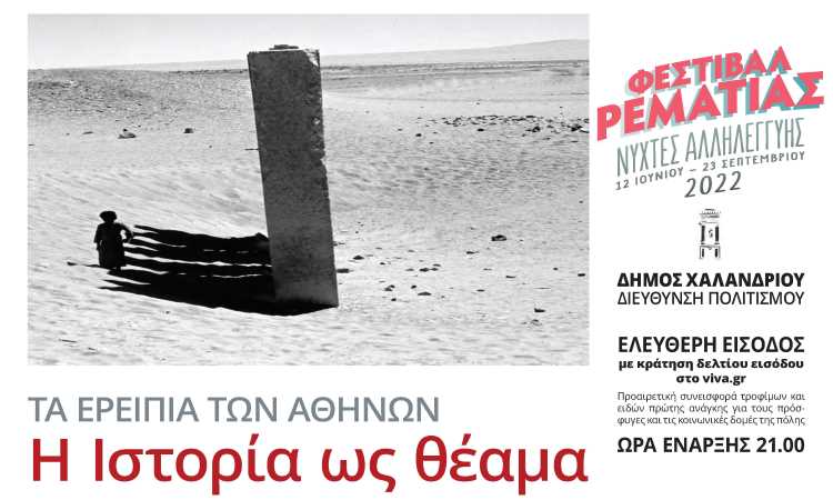Το πολιτικό δρώμενο «Τα ερείπια των Αθηνών – Η Ιστορία ως θέαμα», εμπνευσμένο από το βιβλίο του Τάκη Σιμώτα «Η Ιστορία ως θέαμα και ως όργανο πολιτικού προσανατολισμού» – που βασίζεται σε κείμενα του Ηροδότου, του Ξενοφώντα και του Θουκυδίδη – σε σκηνοθεσία Σπύρου Βραχωρίτη, φιλοξενεί το Φεστιβάλ Ρεματιάς 2022 – Νύχτες Αλληλεγγύης, το Σάββατο 24 Σεπτεμβρίου, στις 21:00 (ύστερα από αναβολή της εκδήλωσης κατά μία μέρα, λόγω μετεωρολογικής πρόγνωσης για έντονες βροχοπτώσεις την αρχικά προγραμματισμένη ημερομηνία).