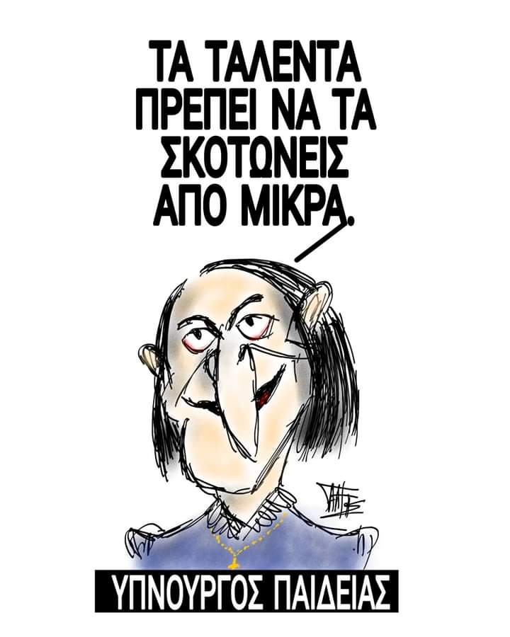 Αναφορικά με το νέο νομοσχέδιο περί κατάργησης των Καλλιτεχνικών Μαθημάτων από τα Λύκεια πολλοί είναι οι καλλιτέχνες που έχουν εκφράσει ανοιχτά την αντίθεσή τους στα μέσα κοινωνικής δικτύωσης. Ο ηθοποιός, που συνηθίζει να σχολιάζει την επικαιρότητα με τα σκίτσα του, παρουσιάζει την “Υπνουργό Παιδείας” δηλώνοντας έτσι ξεκάθαρα την αντίθεσή του σχετικά με την προαναφερθείσα πρόταση του Υπουργείο Παιδείας & Θρησκευμάτων.