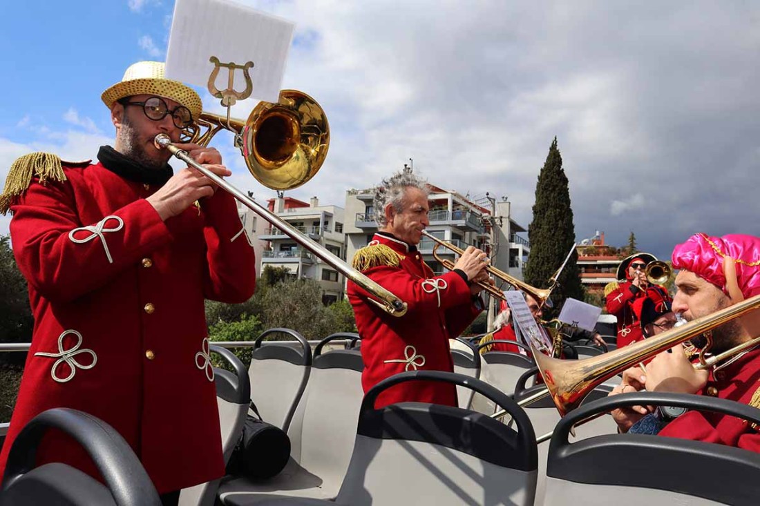 Η Φιλαρμονική του Δήμου Χαλανδρίου ταξίδεψε στους δρόμους της πόλης με διώροφο ανοιχτό λεωφορείο και σκόρπισε κέφι και χαρά στο πνεύμα της Αποκριάς.