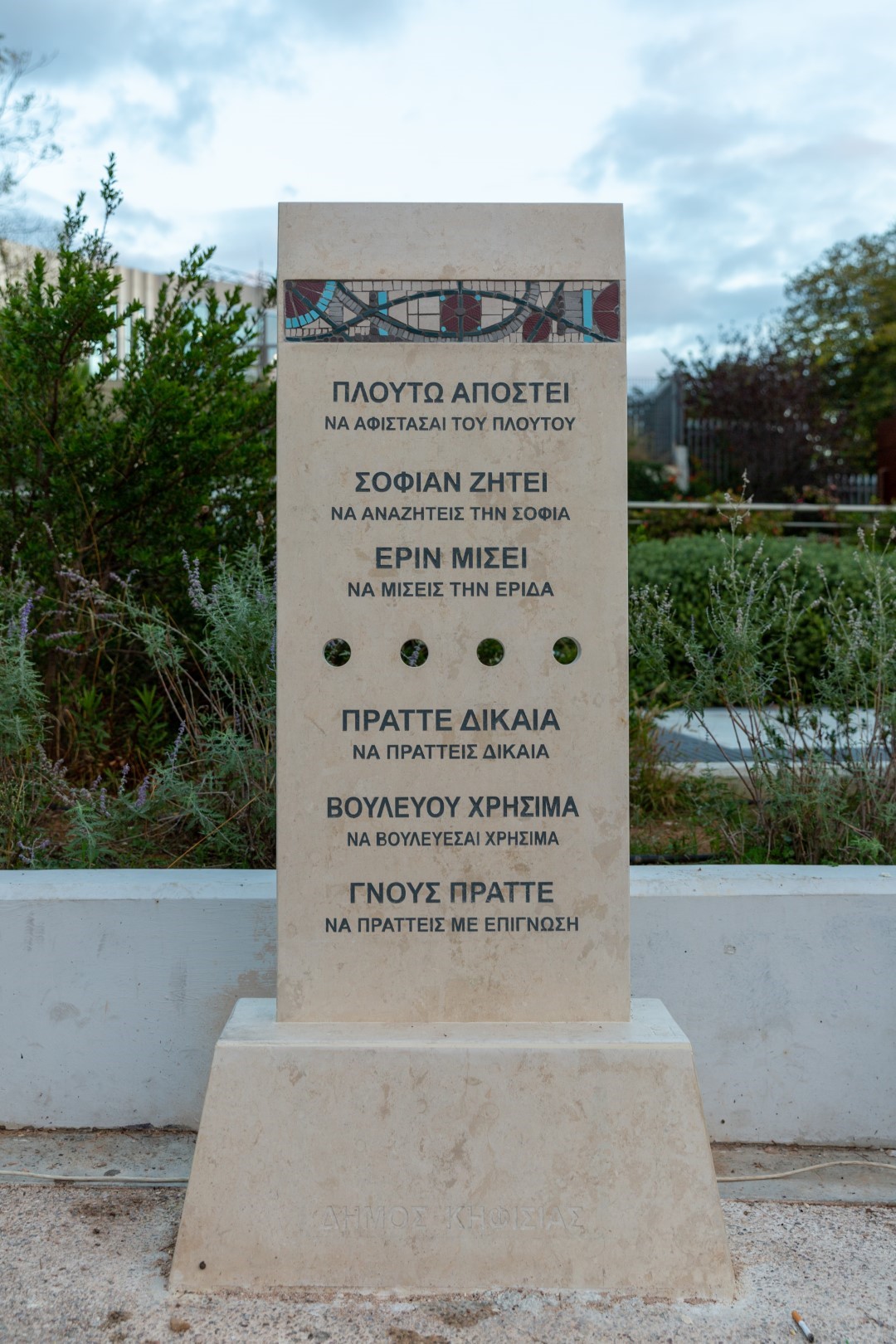 Δελφικά Παραγγέλματα των Επτά Σοφών της αρχαιότητας, που χαράχτηκαν στους τοίχους του μαντείου των Δελφών προκειμένου να εντυπωθούν για πάντα στη συλλογική συνείδηση των πολιτών, αναβιώνουν στην συγκεκριμένη πλατεία. Από τους τοίχους του μαντείου των Δελφών έρχονται στην Κηφισιά ως πανελλήνιες αξίες του Ελληνισμού και ως οδοδείχτες για επιστροφή στις ρίζες μας!