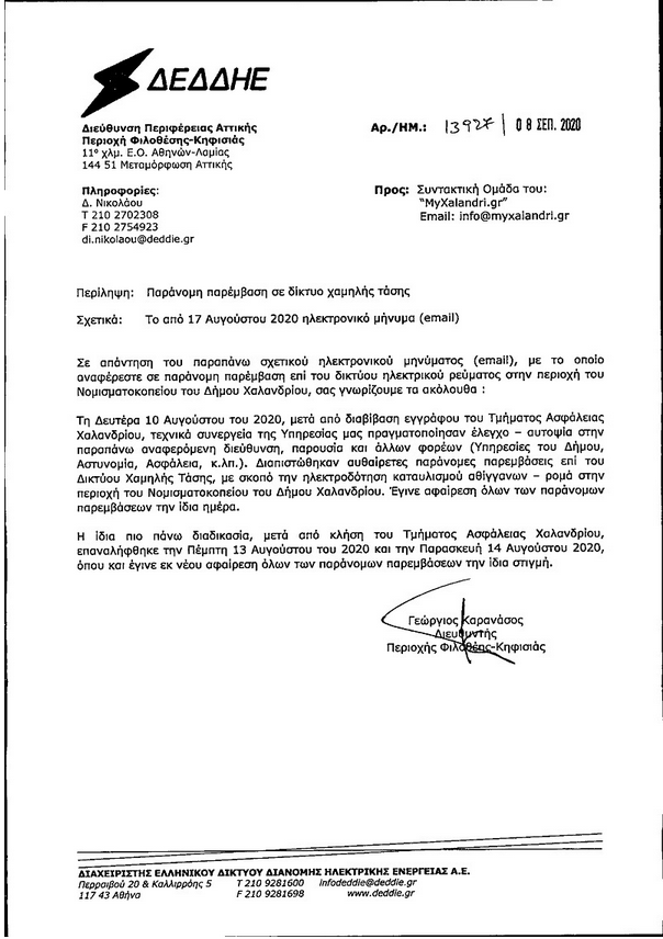 ειδησεογραφικό ιστότοπο «myhalalndri.gr», ο ΔΕΔΔΗΕ αποκαθιστά την αλήθεια σε