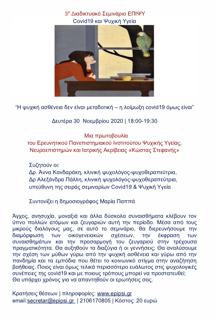 μικρούς διαλόγους μας, στο 3ο διαδικτυακό σεμινάριο του ΕΠΙΨΥ τη Δευτέρα 30 Νοεμβρίου θα διερευνηθεί η διαμόρφωση των οικογενειακών σχέσεων, η έκφραση των