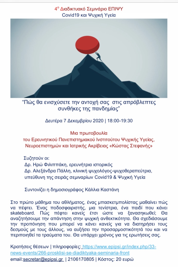 Στο 4ο διαδικτυακό σεμινάριο το οποίο θα πραγματοποιηθεί τη Δευτέρα 7 Δεκεμβρίου στις 18:00 θα αναζητηθεί μια απάντηση στην ερώτηση που προβληματίζει όλους: “Πώς πέφτει κανείς ώστε να ξανασηκωθεί;”