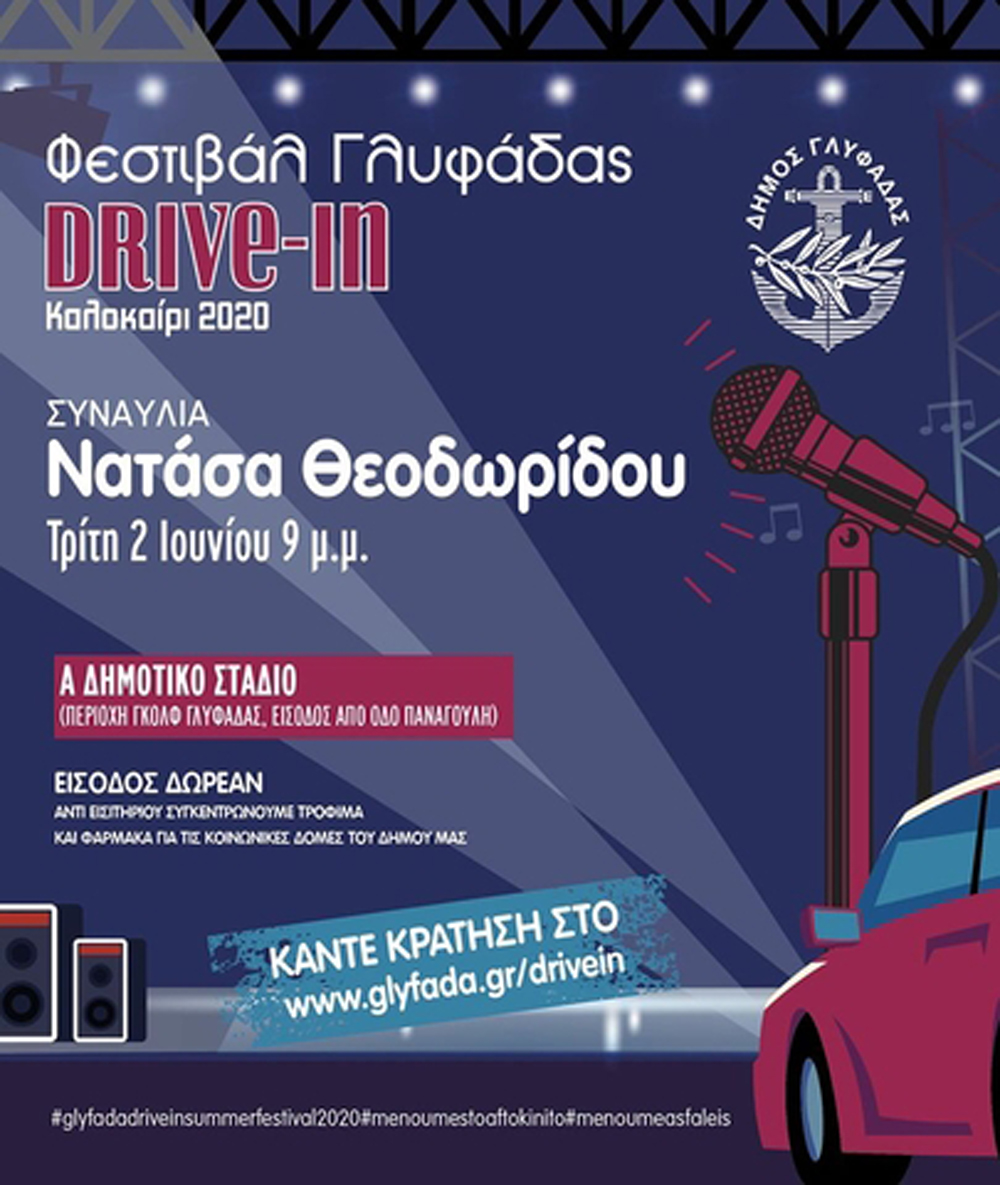 φεστιβάλ με ταινίες, είναι το Θερινό Ντράιβ Ιν στην Γλυφάδα. Θα λειτουργεί στο Γκολφ Γλυφάδας, με δωρεάν είσοδο, ενώ αντί εισιτηρίου, θα συγκεντρώνει τρόφιμα και φάρμακα για τις κοινωνικές δομές του δήμου. Επίσης, θα προβάλλει τόσο κινηματογραφικές ταινίες, όσο και θεατρικές παραστάσεις και συναυλίες.